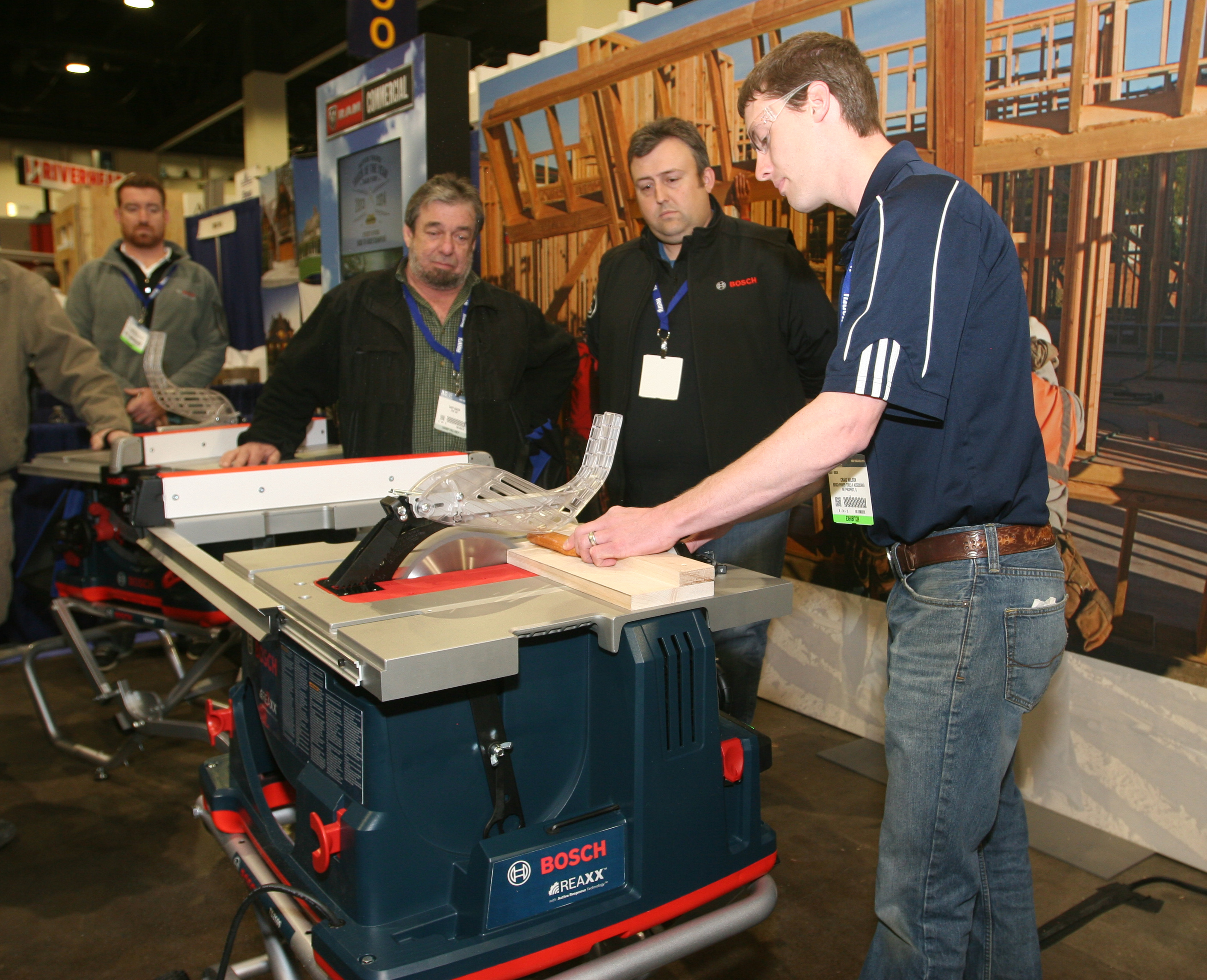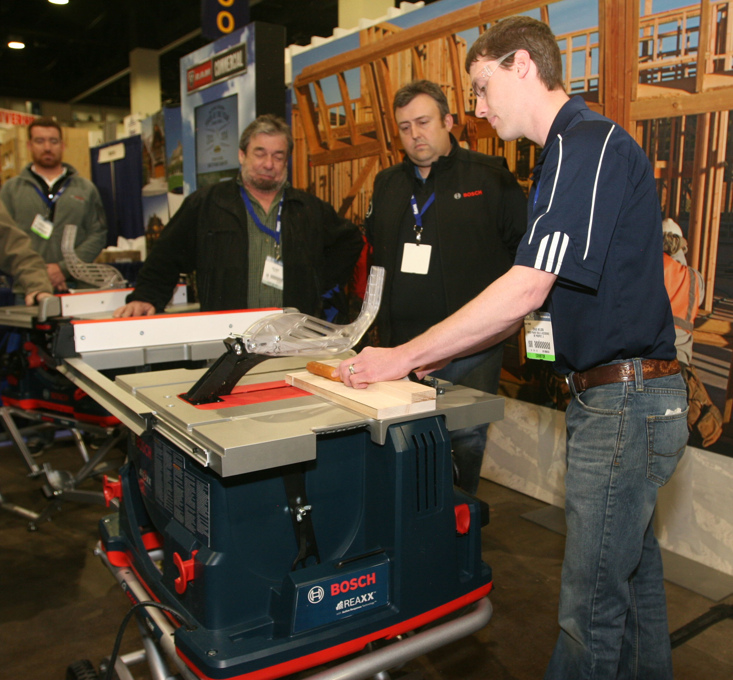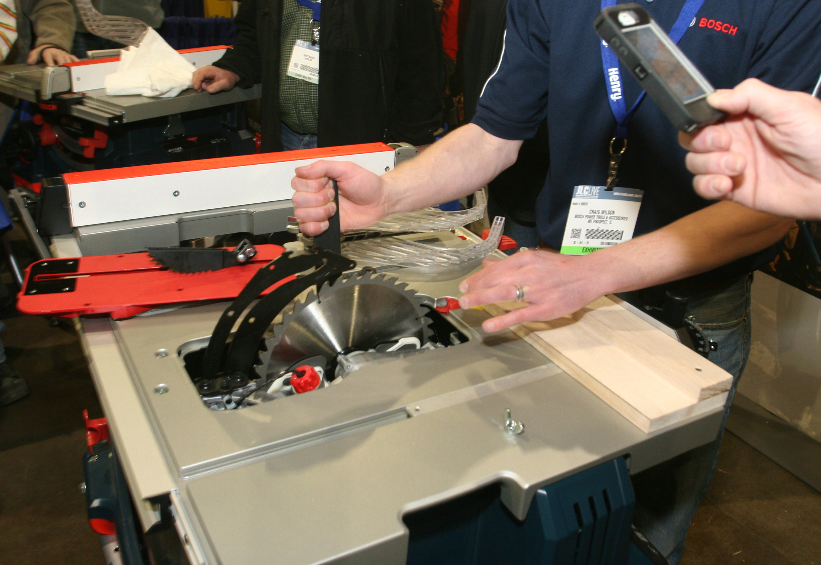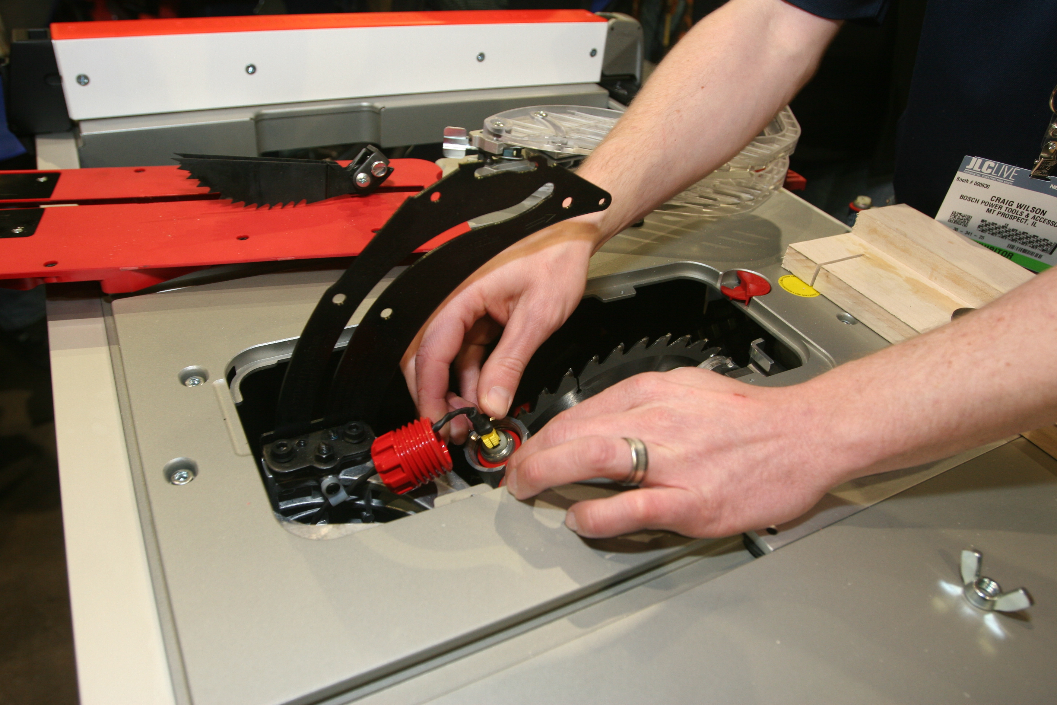 Patrick McCombeLast Wednesday, Bosch announced that it had developed a flesh-sensing tablesaw meant to prevent the finger-amputation injuries that are so common among carpenters and woodworkers. Although the saw won’t be available until the fall, I got a chance to see a preproduction model at the Northeast JLC Live trade show on Friday. Like SawStop’s line of saws, Bosch’s REAXX ($1500 list) uses the principal of capacitance to trigger the finger-saving technology. What’s different is that the REAXX doesn’t attempt to stop the blade, but instead forces it below the saw table within milliseconds after the safety device is triggered. It uses a small piston-shaped cartridge with an explosive charge much like those in automotive airbags to force the saw below the table. Each cartridge can be used twice. Replacement cartridges cost $99.