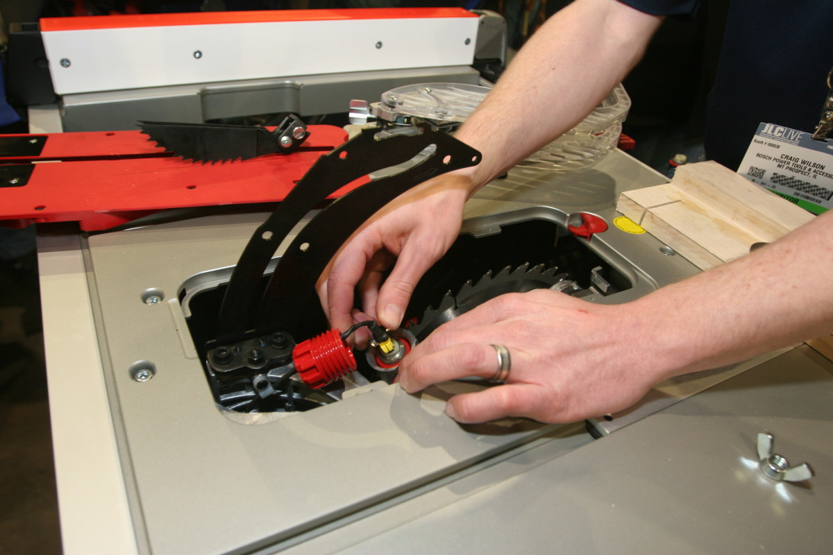 When the safety system is triggered, it locks the blade below the table until you reset it. After swapping the spent cartridge for an unfired cartridge, free the locked trunnion by pulling up on the saw arbor with the blade wrench while holding a small button in front of the blade.